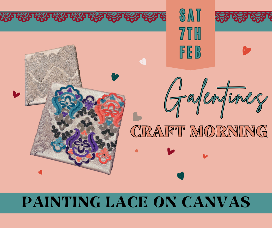 For our Galentine’s gathering, we will be painting on lace that has been secured to an 8×8 canvas, creating natural sections that function like a paint by number. No art experience is needed, and this event is open to any woman who would like to attend.